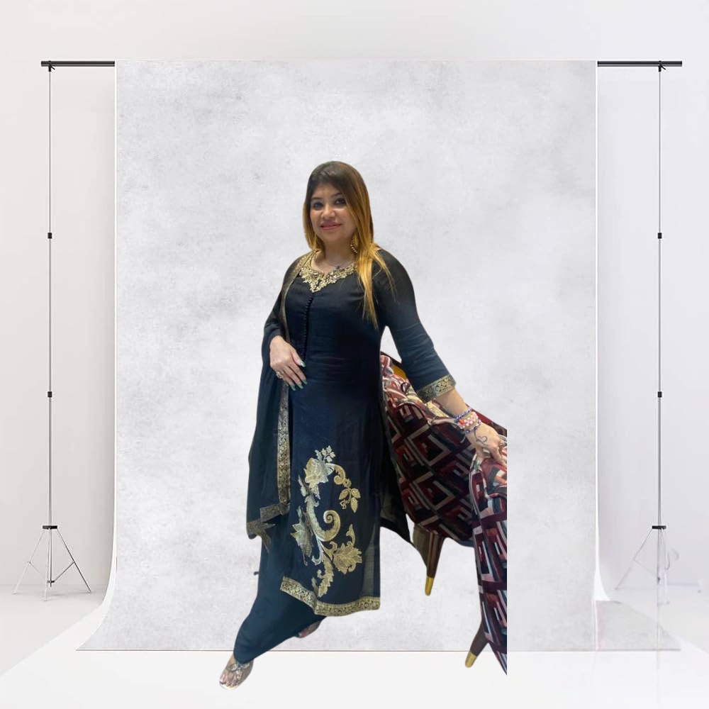 This elegant black suit is adorned with golden embroidery on the neckline, sleeves, and hem, adding a royal touch. Paired with a matching dupatta, it is perfect for evening events, festive celebrations, or formal gatherings.