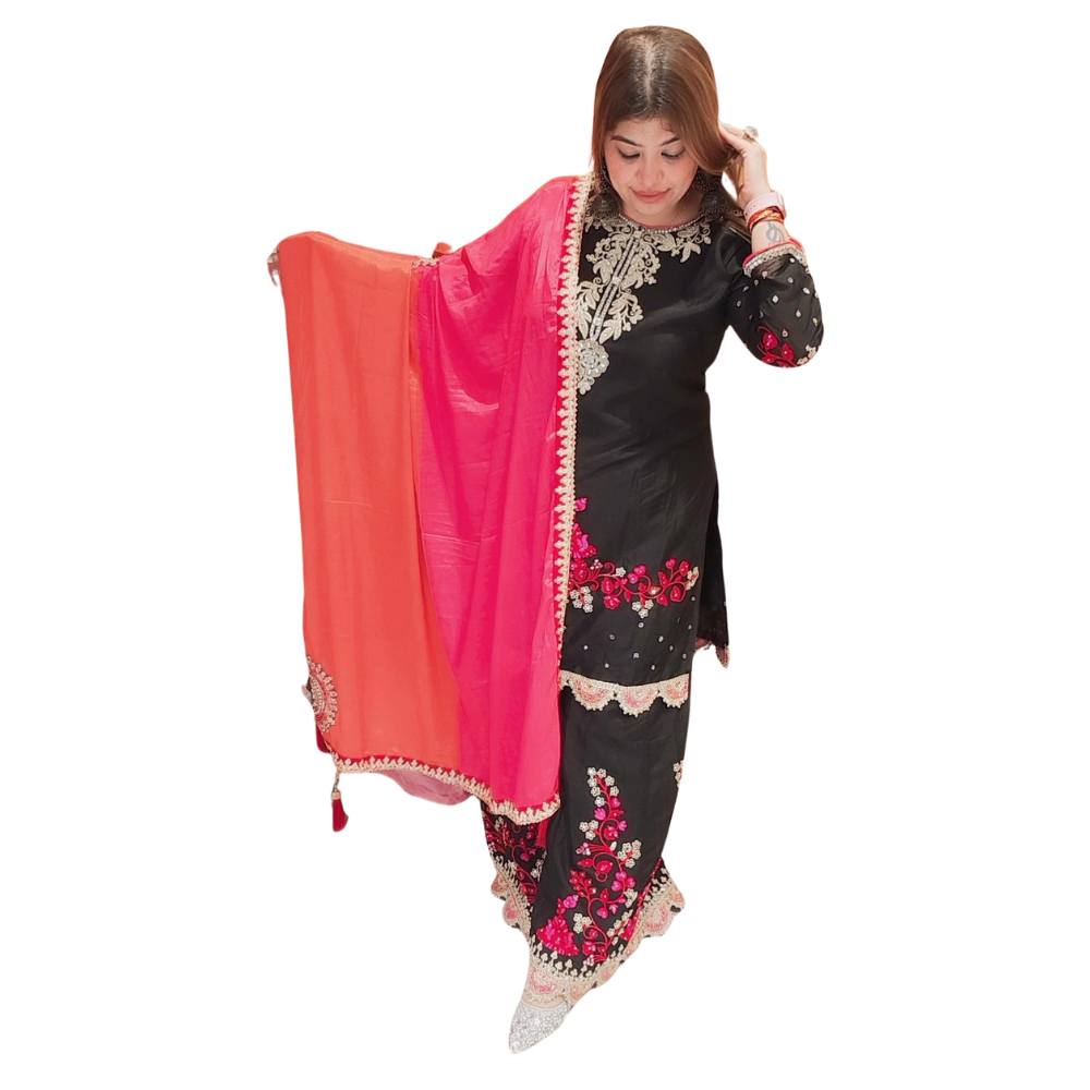This elegant black floral suit is highlighted with intricate embroidery and vibrant pink-red floral motifs. Paired with a contrasting orange-pink dupatta, it beautifully balances grace and vibrance, making it a perfect pick for parties, festive events, and evening gatherings.