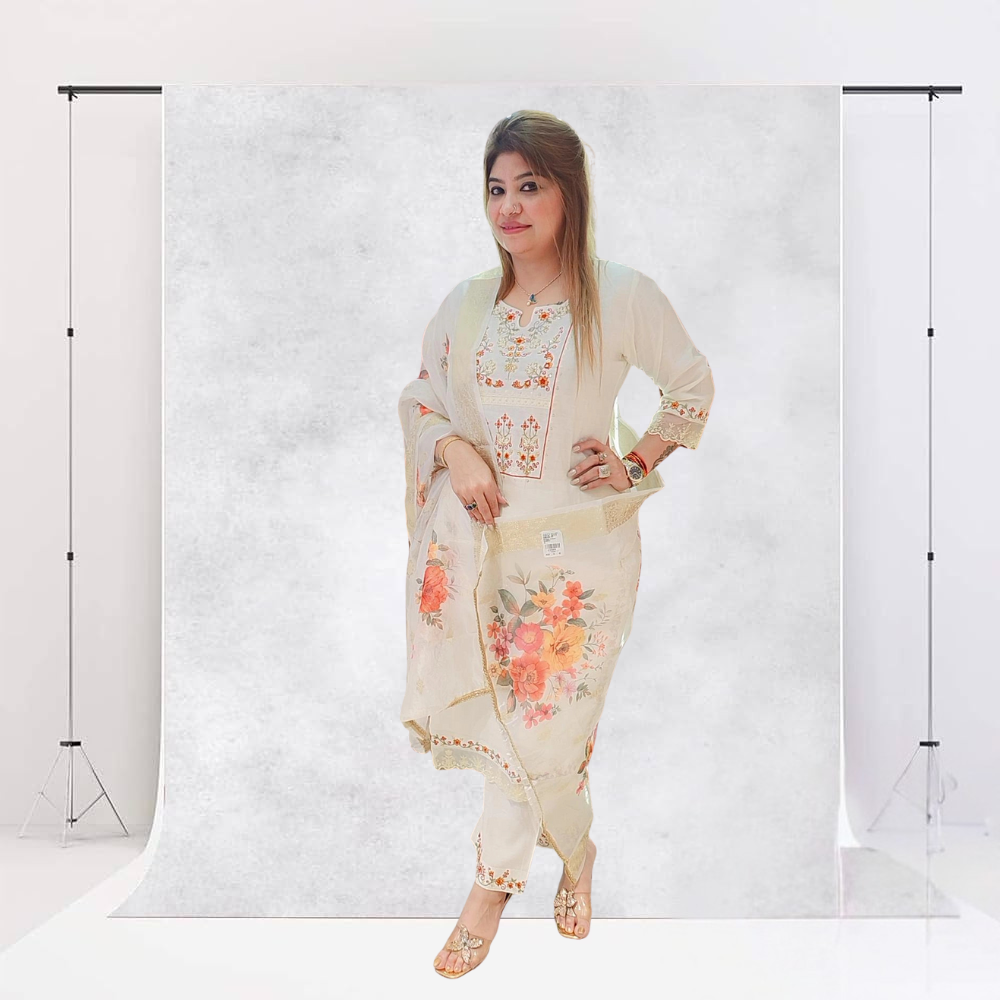 This white suit is crafted in soft fabric with delicate embroidery on the front and a floral printed dupatta. Perfect for daily wear or small gatherings, it gives a graceful and elegant look.